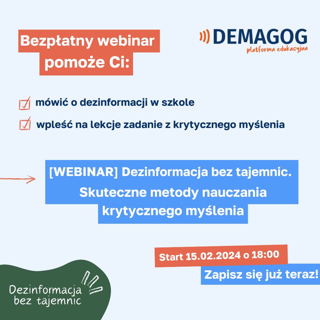 Dlatego serdecznie zapraszamy wszystkich nauczycieli i nauczycielki do udziału w bezpłatnym webinarze „Dezinformacja bez tajemnic. Skuteczne metody nauczania krytycznego myślenia”. Jego organizatorem jest Stowarzyszenie Demagog, które już od 10 lat walczy z dezinformacją i fake newsami, a także prowadzi warsztaty dla nauczycieli i uczniów w tym zakresie.