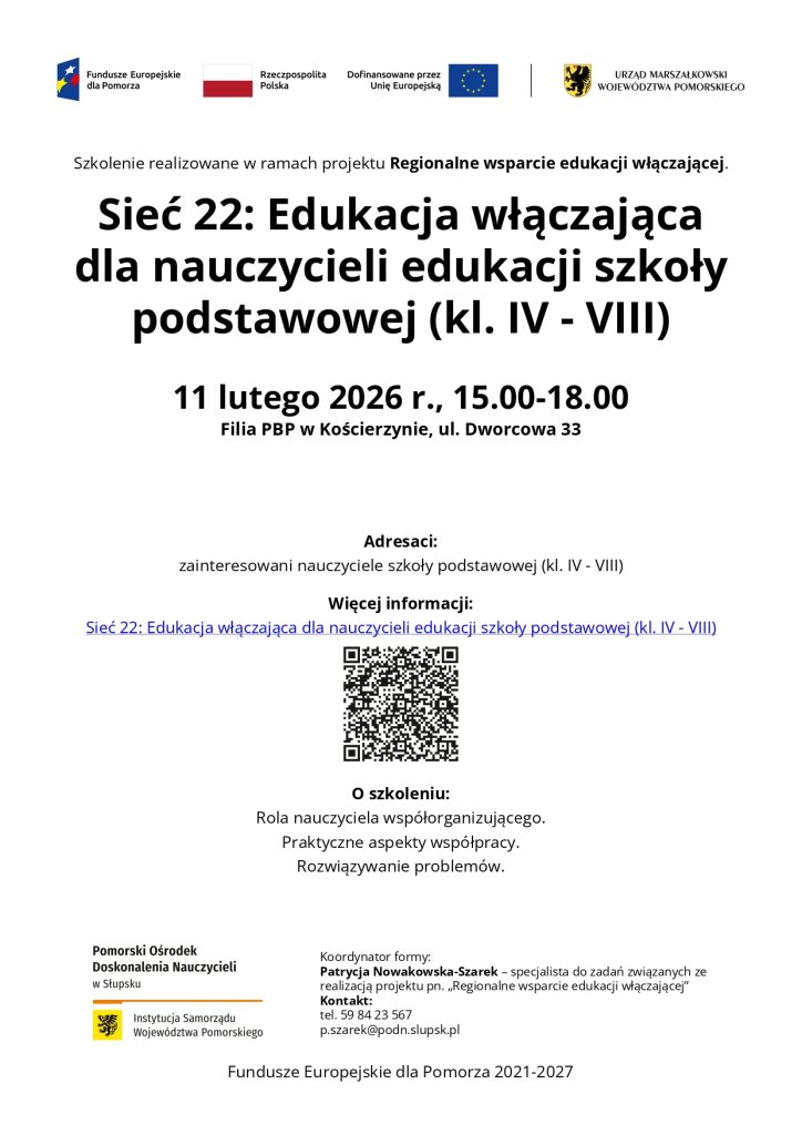 Szkolenie odbędzie się 11 lutego 2026 roku w godzinach 15.00–18.00 w naszej Filii w Kościerzynie przy ul. Dworcowej 33. Spotkanie realizowane jest w ramach Sieci 22: Edukacja włączająca dla nauczycieli edukacji szkoły podstawowej (kl. IV–VIII).