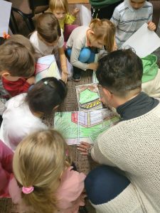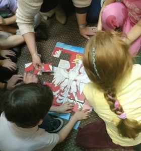 Podczas części warsztatowej uczestnicy tworzyli chorągiewki, układali godło Polski oraz przygotowywali własne portrety Misia Wojtka, dzięki czemu jeszcze lepiej zapamiętali bohatera zajęć i znaczenie symboli narodowych.