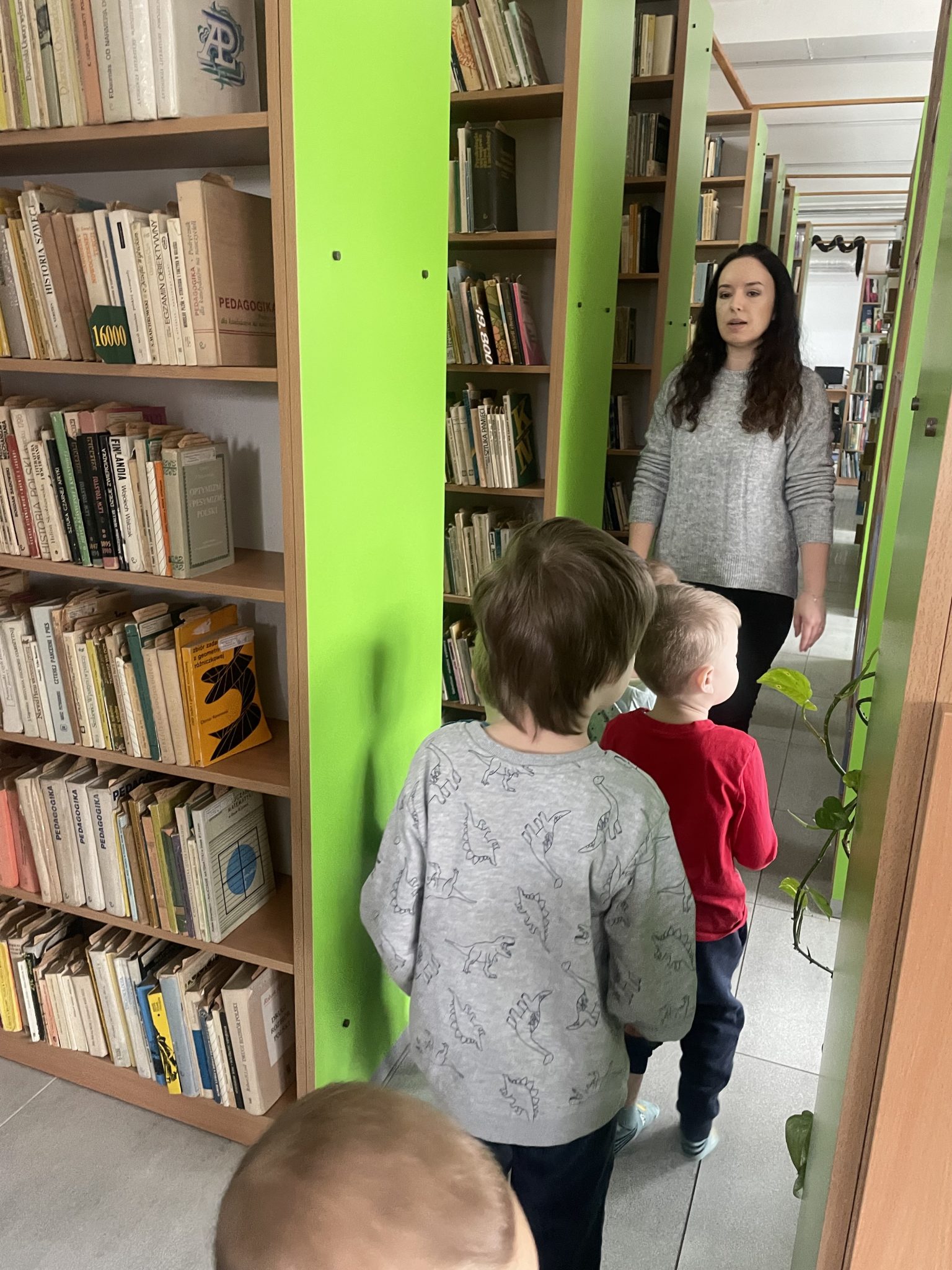 Następnie przedszkolaki miały okazję zwiedzić zakamarki biblioteki. Z ciekawością oglądały regały pełne książek, poznawały sposób ich ustawiania oraz zobaczyły, jak wygląda miejsce pracy bibliotekarza.