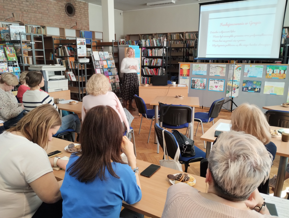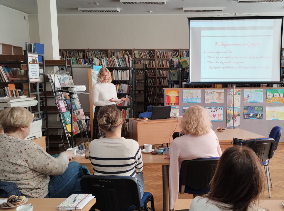 Pedagożka prowadząca spotkanie bardzo zainteresowała tematem zebranych nauczycieli, którzy na co dzień obserwują dzieci i nierzadko dostrzegają nieprzystawalność warunków szkolnych do indywidualnych potrzeb dziecka. Na spotkaniu panowała ożywiona dyskusja, bibliotekarki dzieliły się swoimi doświadczeniami. Wskazywały też na problemy w komunikowaniu się z rodzicami.