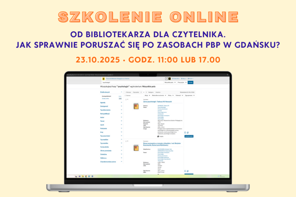 Webinar „Od bibliotekarza dla czytelnika. Jak sprawnie poruszać się po zasobach PBP w Gdańsku?” odbędzie się na platformie ClickMeeting 23 października 2025 r. (czwartek) o dwóch porach do wyboru – 11:00 oraz 17:00. Dzięki temu każdy uczestnik będzie mógł wybrać godzinę, która najlepiej wpisze się w jego harmonogram dnia – niezależnie od tego, czy ma wolny poranek, czy łatwiej mu wygospodarować czas popołudniu.
