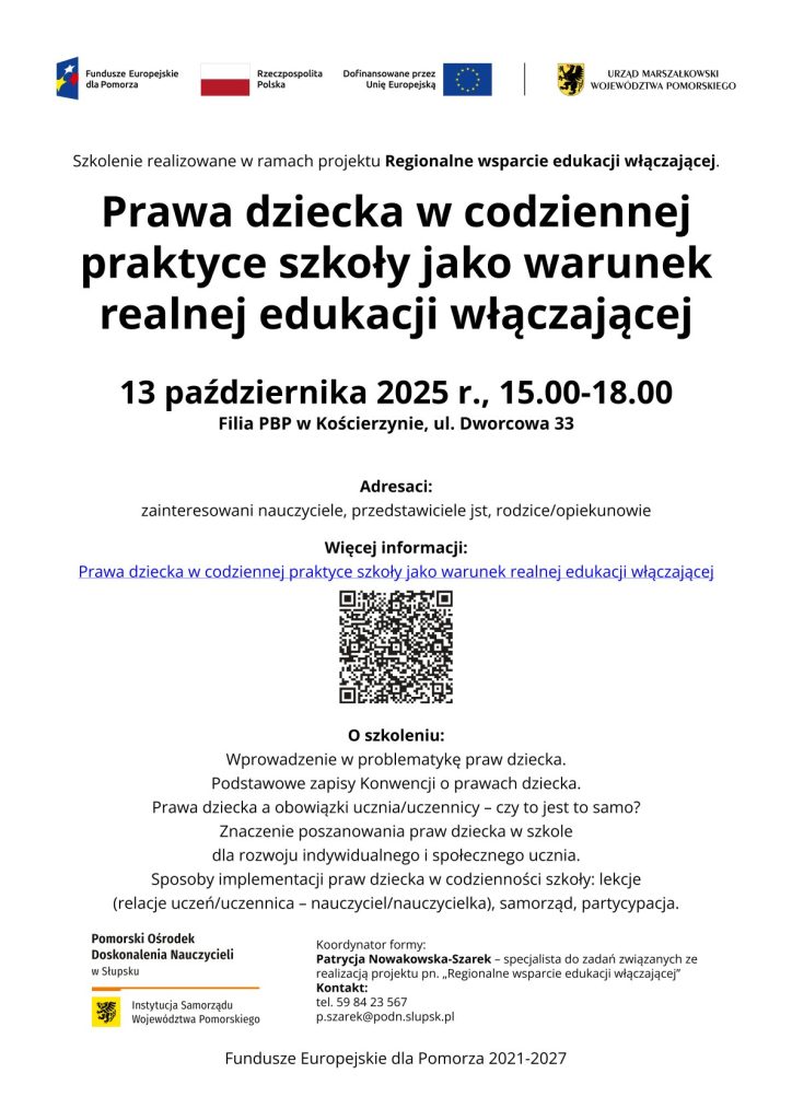Jak skutecznie wdrażać prawa dziecka w szkolnej rzeczywistości? Na to pytanie odpowiedzą uczestnicy szkolenia „Prawa dziecka w codziennej praktyce szkoły jako warunek realnej edukacji włączającej”, które odbędzie się już 13 października 2025. Wydarzenie realizowane jest w ramach projektu Regionalne wsparcie edukacji włączającej, dofinansowanego ze środków Unii Europejskiej w ramach Funduszy Europejskich dla Pomorza na lata 2021-2027.