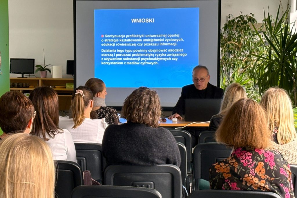 Po przerwie wyniki badania, którego celem było zdiagnozowanie zjawiska używania substancji psychoaktywnych, doświadczania przemocy domowej i rówieśniczej oraz zagrożeń związanych z używaniem mediów cyfrowych przez młodzież szkolną, przedstawił Andrzej Makowski, członek Miejskiej Komisji Rozwiązywania Problemów Alkoholowych i kierownik Punktu Konsultacyjnego dla Młodzieży Uzależnionej w Starogardzie Gdańskim. Badaniem, za pomocą ankiety audytoryjnej, zostali objęci uczniowie klas VI-VIII szkoły podstawowej. We wnioskach, wynikających z diagnozy, prelegent przedstawił zalecane działania profilaktyczne, jakie należy wdrożyć, kierując je zarówno do uczniów, jak i ich rodziców.