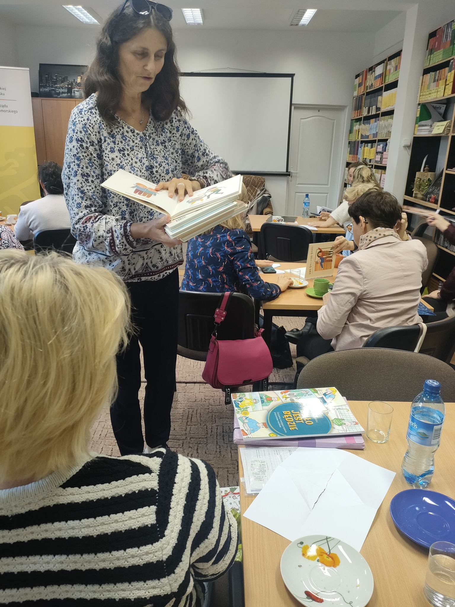 Uczestnicy mieli okazję poznać różnorodne picturebooki – książki obrazkowe, które pobudzają wyobraźnię, wspierają rozwój emocjonalny i stają się punktem wyjścia do rozmowy z dziećmi. Małgorzata Swędrowska dzieliła się sprawdzonymi metodami i pomysłami, jak poprzez wspólne czytanie budować więź z dziećmi i zachęcać je do samodzielnego sięgania po książki.