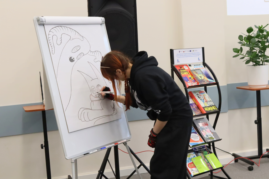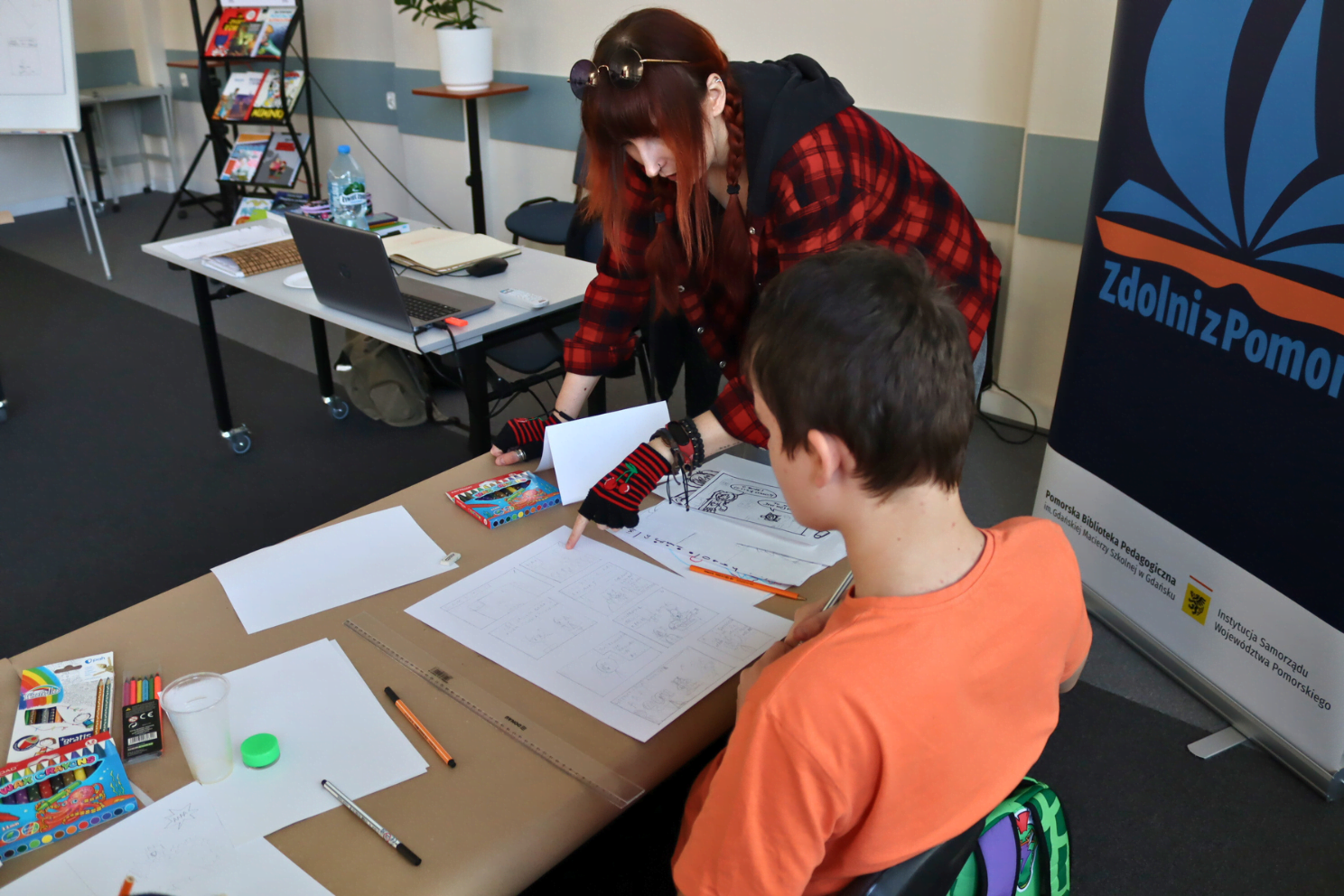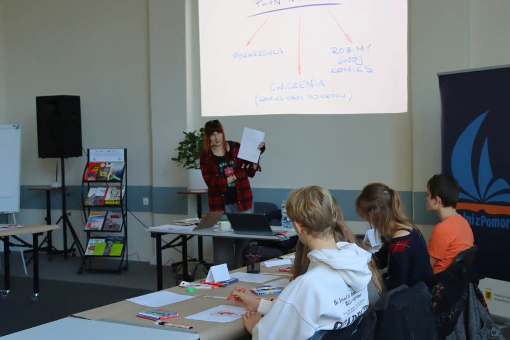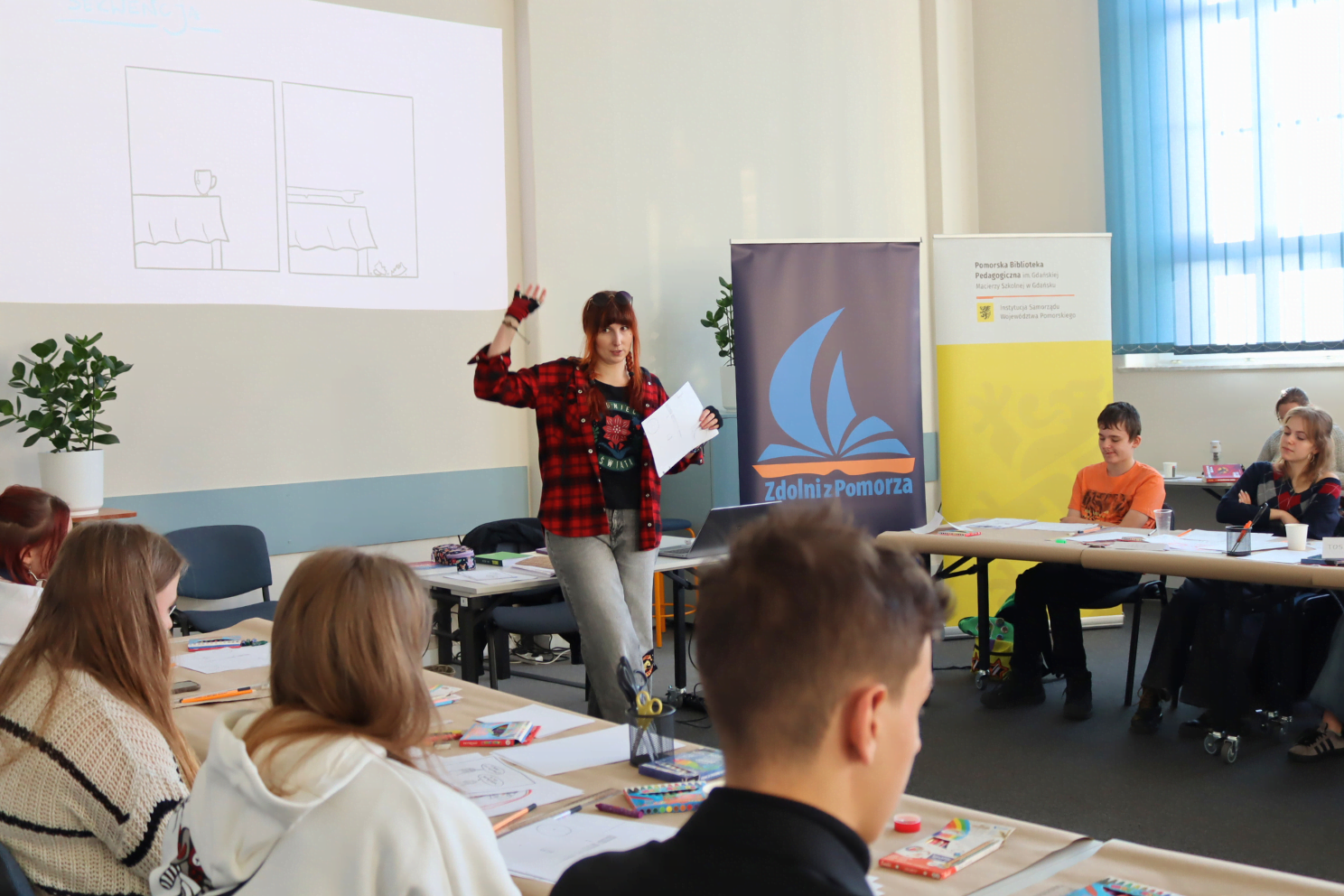 Nasza biblioteka na dwa dni zamieniła się w pracownię komiksową. Gościliśmy w naszych murach młodzież szkolną z Pomorza, która uczyła się tej sztuki rysunkowej podczas warsztatów z Talą Nowińską – ilustratorką, autorką krótkich form komiksowych i graficzką.