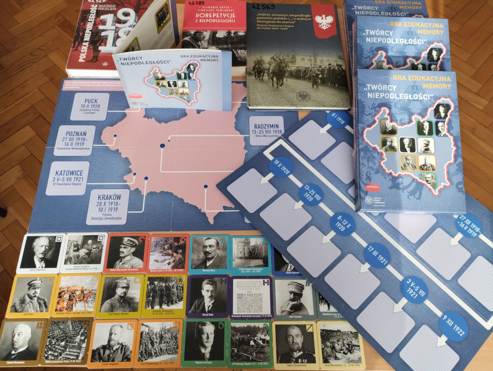 Atrakcyjnym dodatkiem dla uczestników zabawy i przydatnym narzędziem była dwustronna plansza. Oś czasu przedstawiała daty ułożone chronologicznie. Zadaniem dla ucznia było dopasowanie płytki z wydarzeniem do daty. Gra „Twórcy niepodległości” to efektowna forma sprawdzania wiedzy i atrakcyjna metoda wizualna wspierająca zapamiętywanie kolejności i terminów. Jej bohaterami byli m. in. Ignacy Paderewski, Wincenty Witos, Józef Piłsudski czy Gabriel Narutowicz.