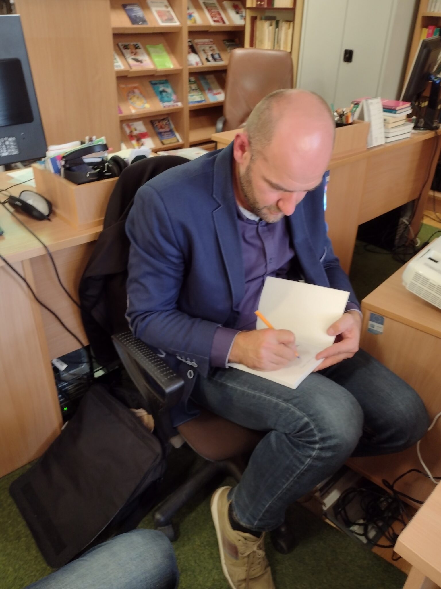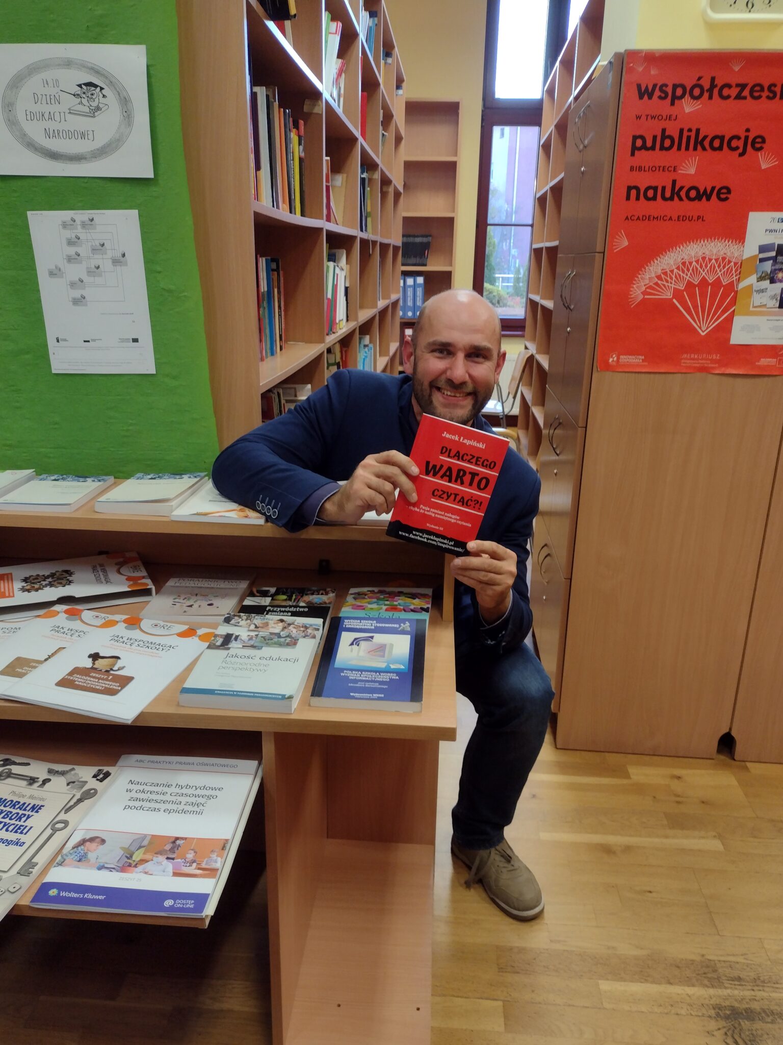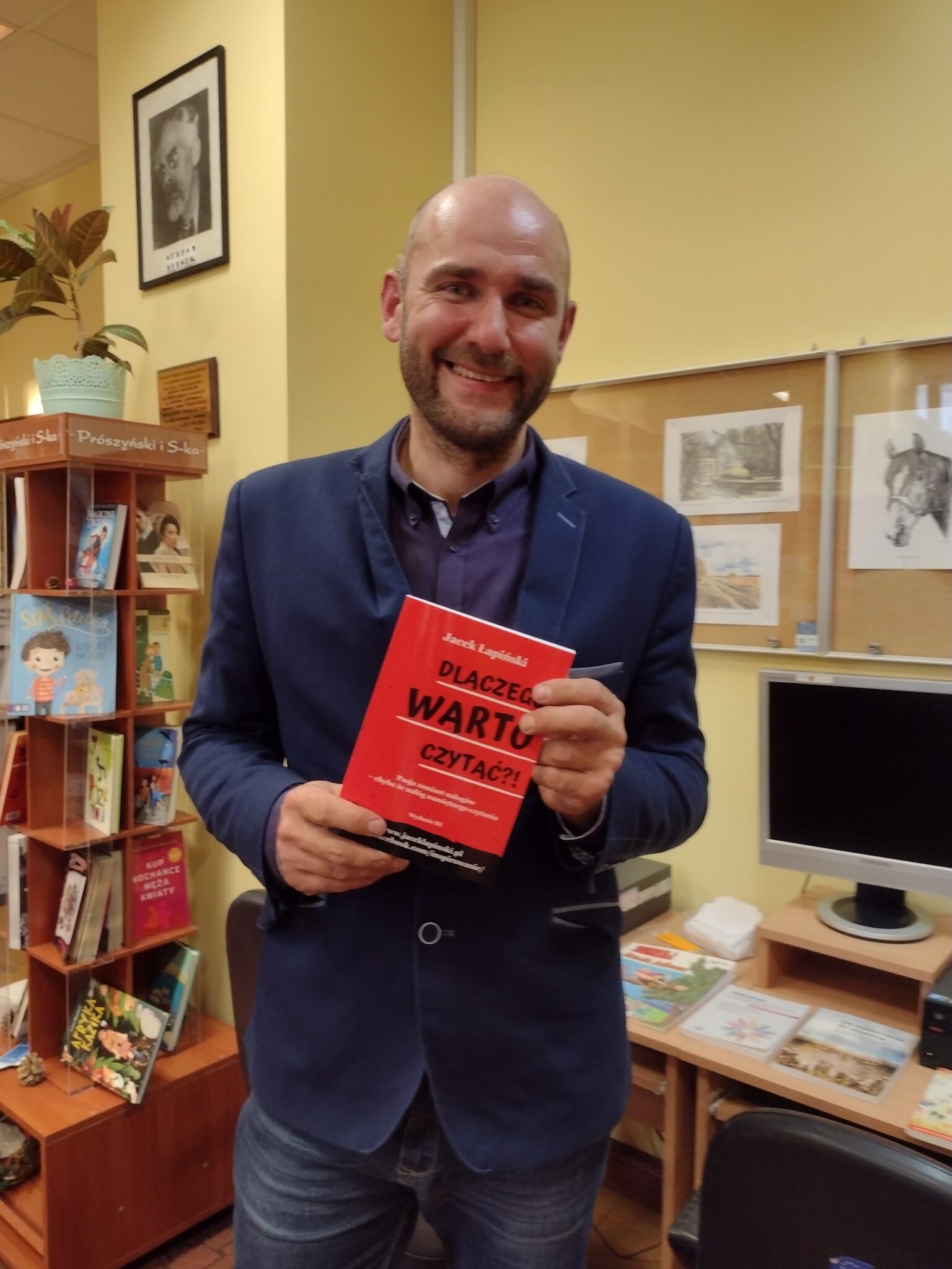 i przekonuje, że warto sięgać po książki z różnych dziedzin, nie tylko z tej zawodowej. Czytanie dla przyjemności poszerza nasze horyzonty, pomaga nam odpocząć, podsuwa dobre myśli, dostarcza inspiracji, karmi umysł. Im więcej czytamy, tym wyżej ustawimy sobie poprzeczkę. Podczas spotkania mogliśmy zapoznać się twórczością autora: „Z uśmiechem Ci do twarzy”, „Dlaczego warto czytać”. Wśród pytań kierowanych do pisarza były również prośby o wskazówki jak rozbudzać pasje czytelnicze wśród młodzieży. Pan Jacek chętnie i z humorem, na wszystkie odpowiadał.