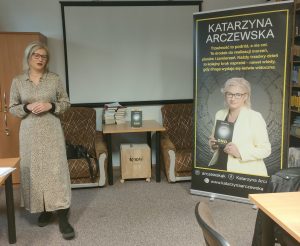 W drugiej części spotkania wystąpiła Katarzyna Arczewska – terapeutka pracująca na co dzień z osobami zmagającymi się z uzależnieniami oraz ich rodzinami. Prowadzi terapie indywidualne i grupowe, a podczas wystąpienia opowiedziała o różnych formach współczesnych uzależnień, m.in. alkoholizmie, zakupoholizmie czy nadmiernym korzystaniu ze smartfonów. Prelegentka zaprezentowała również swoją książkę „Dno to początek”, która stanowi nie tylko poruszające świadectwo, ale również praktyczne narzędzie wspierające proces zdrowienia.