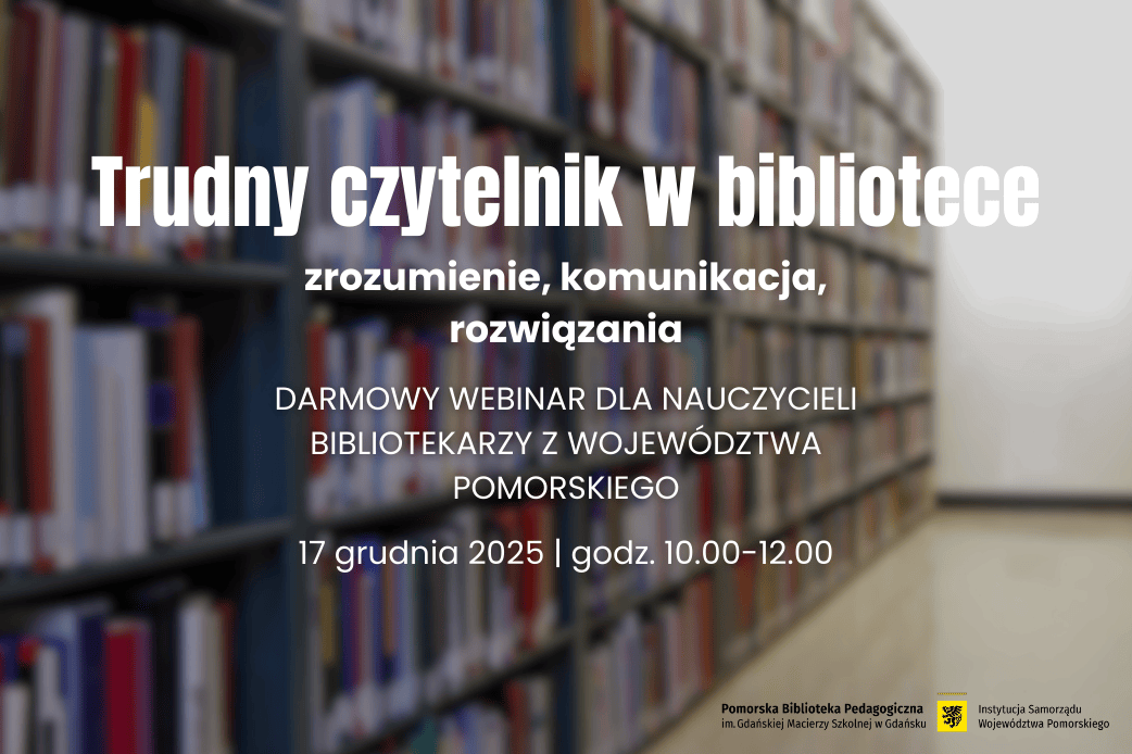 Webinar „Trudny czytelnik w bibliotece: zrozumienie, komunikacja, rozwiązania” jest przeznaczony dla nauczycieli bibliotekarzy z województwa pomorskiego, którzy chcą zmienić podejście do trudnych sytuacji, czerpiąc z siły empatii i profesjonalnej asertywności, aby codzienny kontakt z czytelnikiem stał się źródłem satysfakcji, a nie stresu.