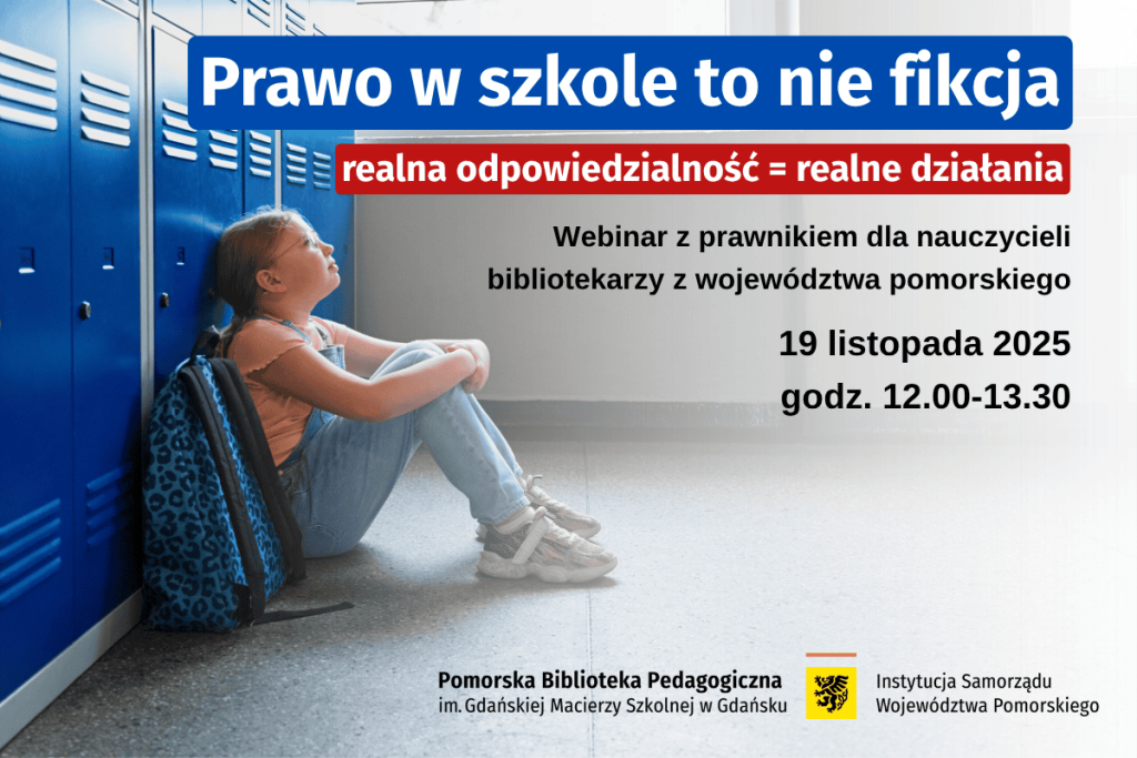Już 19 listopada 2025 roku odbędzie się bezpłatny webinar „Prawo w szkole to nie fikcja – realna odpowiedzialność, realne działania”. Jest on przeznaczony dla nauczycieli bibliotekarzy z województwa pomorskiego. Szkolenie poprowadzi ekspertka w temacie – prawniczka Katarzyna Kurkiewicz.