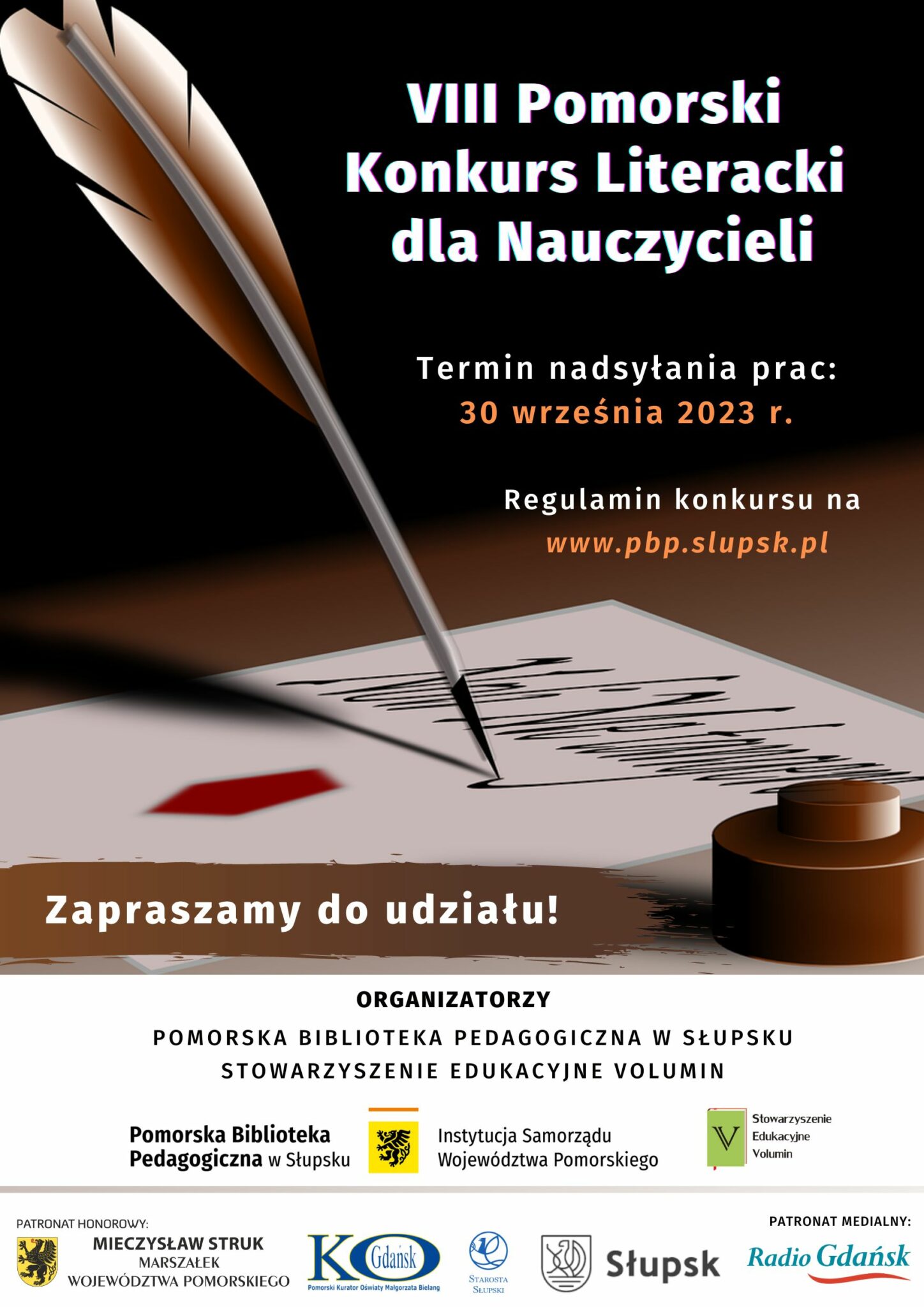Pomorska Biblioteka Pedagogiczna w Słupsku oraz Stowarzyszenie Edukacyjne Volumin organizują kolejną, VIII edycję Pomorskiego Konkursu Literackiego dla Nauczycieli. Prace prosimy nadsyłać do 30 września 2023 roku. Zapraszamy do udziału!