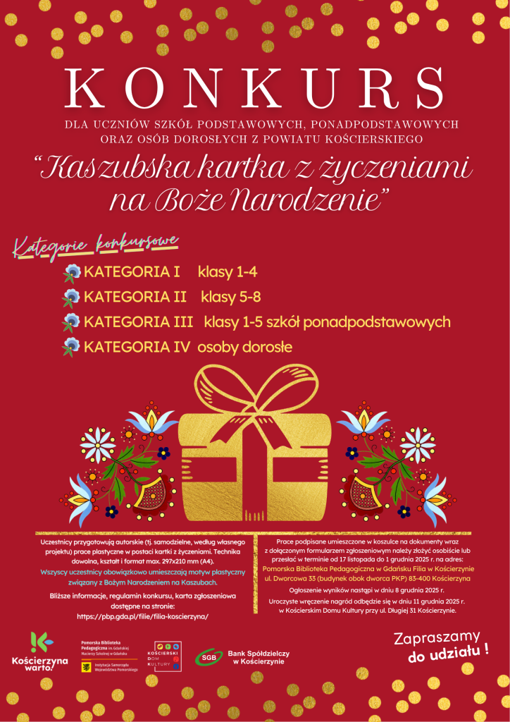 Już po raz ósmy zapraszamy dzieci i dorosłych z powiatu kościerskiego do udziału w wyjątkowym świątecznym konkursie „Kaszubska kartka z życzeniami na Boże Narodzenie”. Prace można przesyłać do 1 grudnia 2025. Szczegóły poniżej.