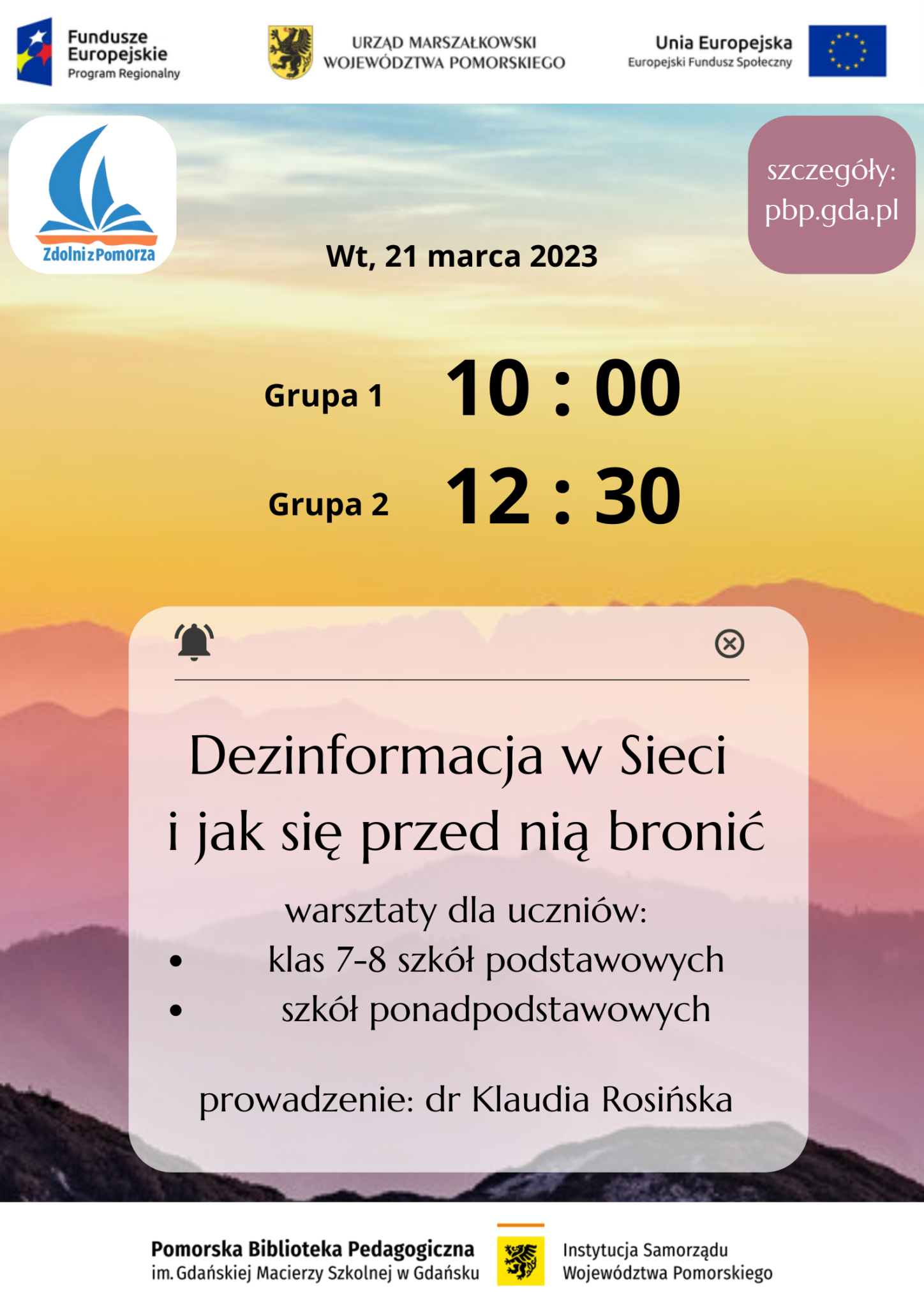 Warsztaty Dezinformacja w Sieci i jak się przed nią bronić z dr Klaudią Rosińską realizowane w ramach projektu Zdolni z Pomorza, odbędą się 21 marca br. w godz.: