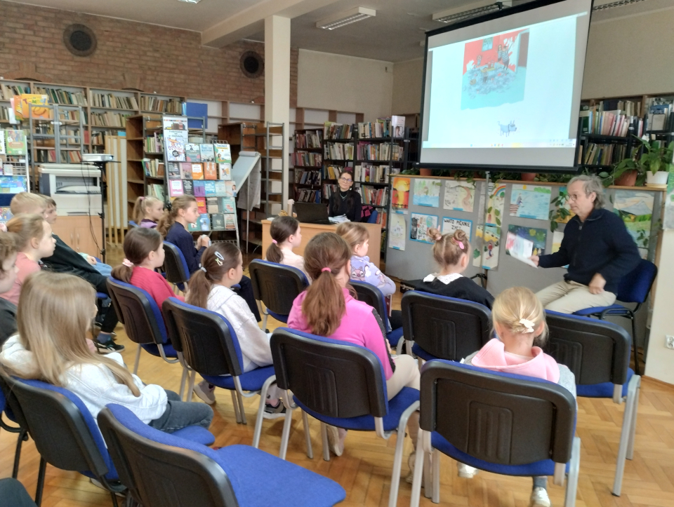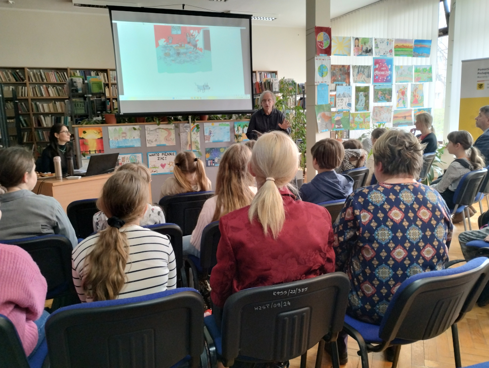 Spotkanie, w którym wzięli udział uczniowie, szybko zamieniło się w pełną wyobraźni podróż literacką. Młodsze dzieci z zainteresowaniem słuchały fragmentów książki „Rodzina Obrabków”, a przygody bohaterów wywoływały śmiech i żywe reakcje. Z kolei starsi uczestnicy poznali fragmenty powieści „Antykwariat pod Błękitnym Lustrem”, przez co atmosfera stała się bardziej tajemnicza i intrygująca.