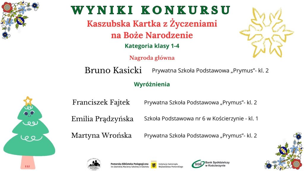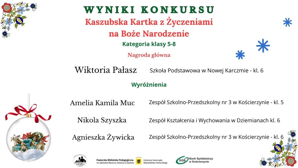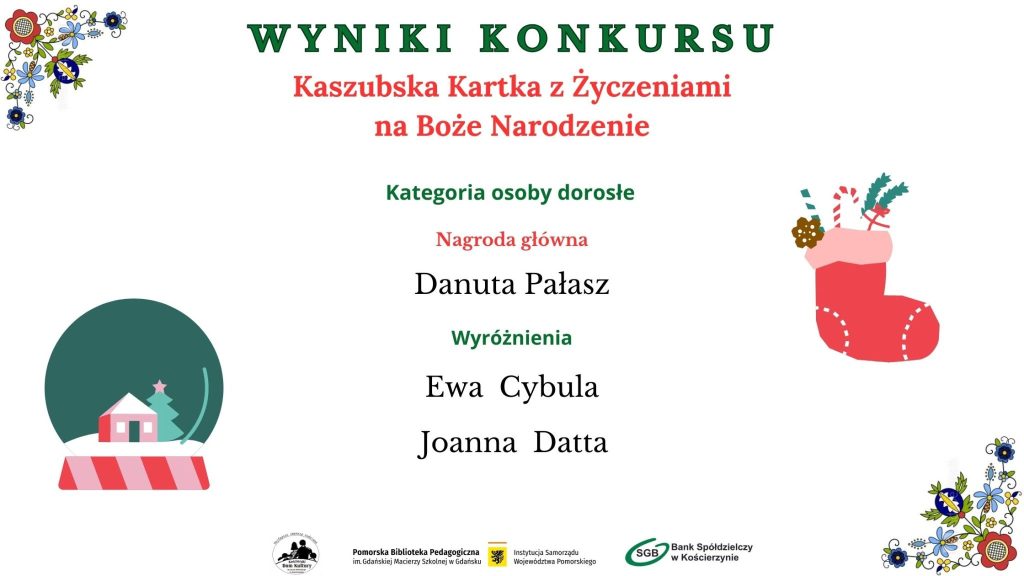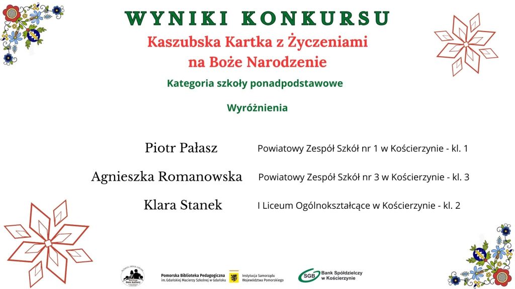 Z radością informujemy, że zakończyła się ósma edycja świątecznego konkursu plastycznego „Kaszubska kartka z życzeniami na Boże Narodzenie”, skierowanego do dzieci i dorosłych z powiatu kościerskiego. Konkurs cieszył się dużym zainteresowaniem, a nadesłane prace zachwyciły jury pomysłowością, różnorodnością technik oraz pięknym oddaniem bożonarodzeniowej atmosfery Kaszub. Poniżej prezentujemy wyniki.