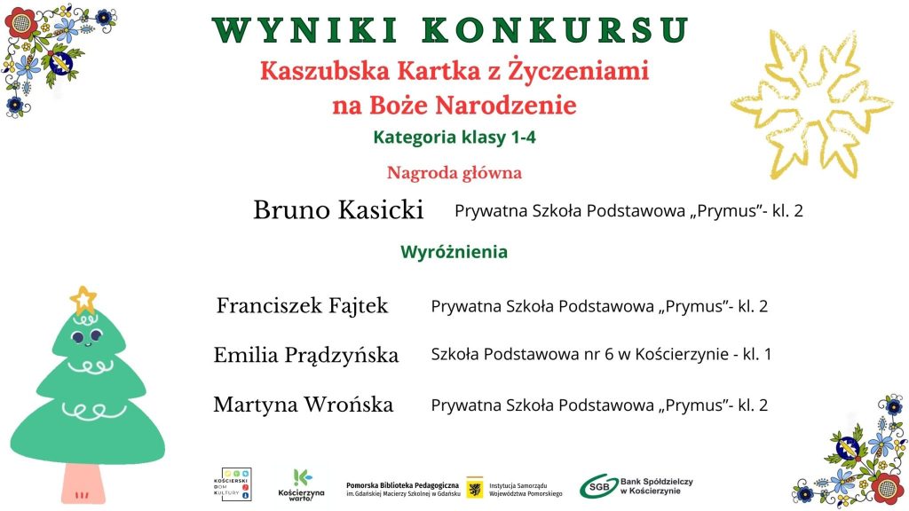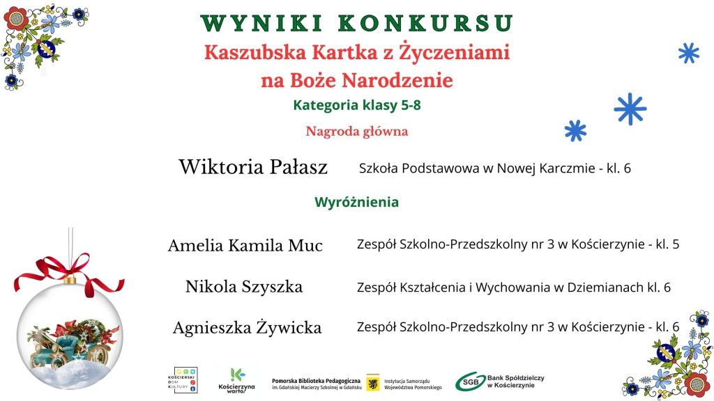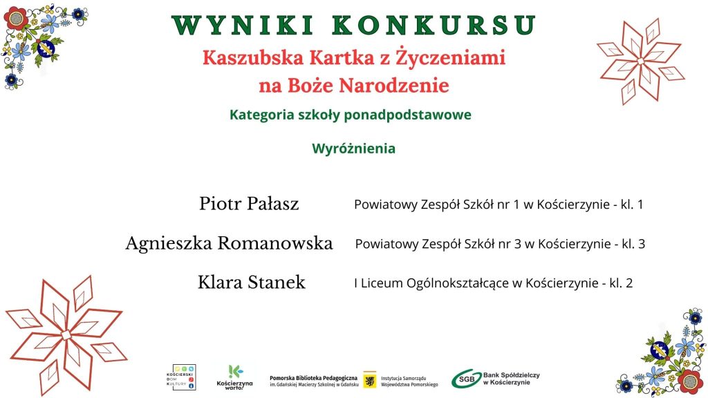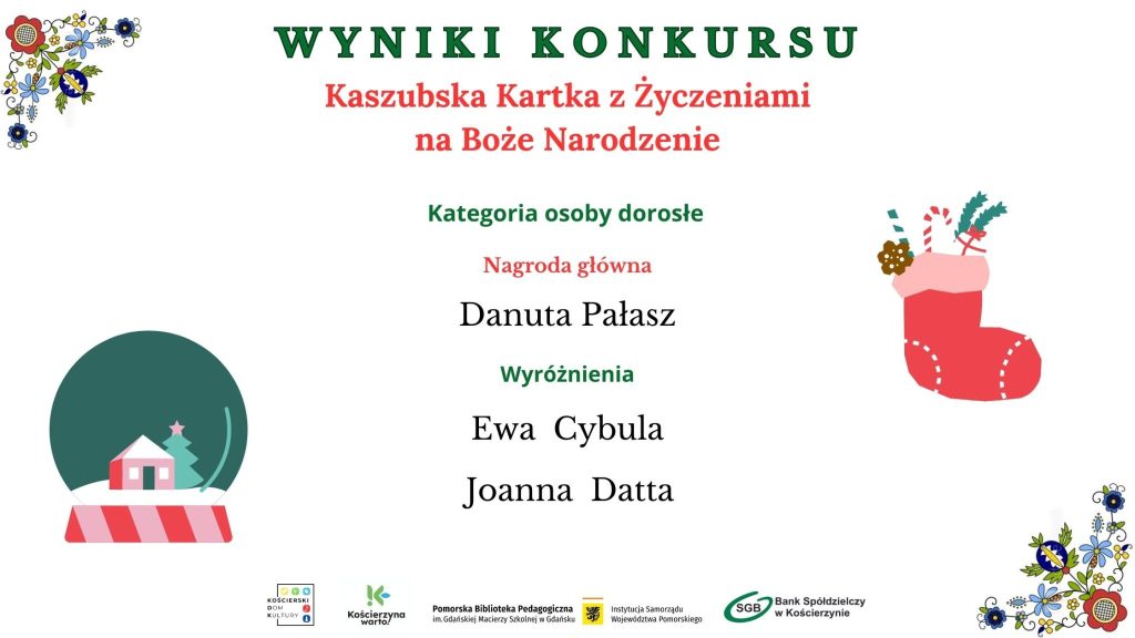 Z radością informujemy, że zakończyła się ósma edycja świątecznego konkursu plastycznego „Kaszubska kartka z życzeniami na Boże Narodzenie”, skierowanego do dzieci i dorosłych z powiatu kościerskiego. Konkurs cieszył się dużym zainteresowaniem, a nadesłane prace zachwyciły jury pomysłowością, różnorodnością technik oraz pięknym oddaniem bożonarodzeniowej atmosfery Kaszub. Poniżej prezentujemy wyniki.