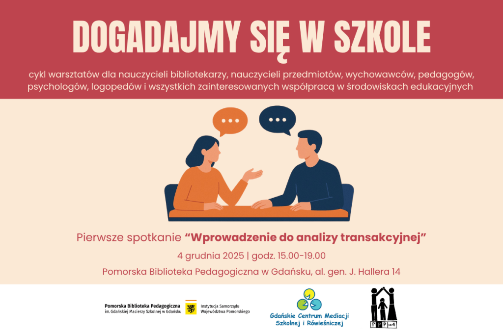 Tematem pierwszego warsztatu jest „Wprowadzenie do analizy transakcyjnej”. Spotkanie odbędzie się już 4 grudnia 2025 w godz. 15.00-19.00 w naszej bibliotece (al. gen. J. Hallera 14).
