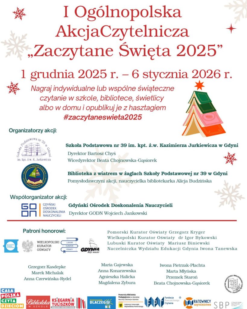 Święta Bożego Narodzenia to czas zatrzymania, refleksji i bycia razem. Właśnie w tym duchu zapraszamy do udziału w I Ogólnopolskiej Akcji Czytelniczej „Zaczytane Święta” – inicjatywie, której nasza biblioteka udzieliła patronatu honorowego. To wyjątkowe zaproszenie do wspólnego czytania i dzielenia się literaturą – bez względu na wiek i miejsce.