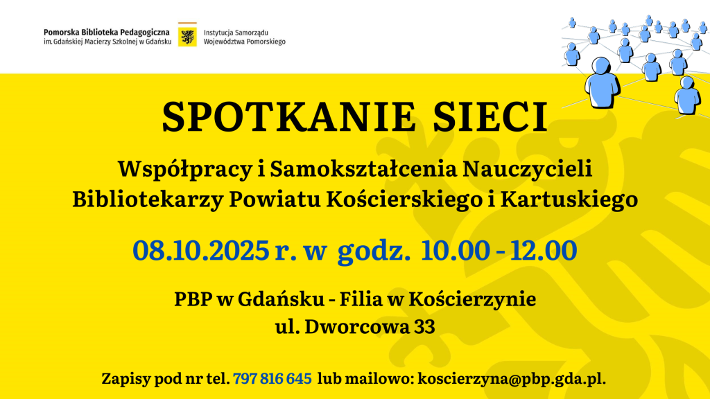 Już 8 października 2025 roku odbędzie się pierwsze w tym roku szkolnym spotkanie sieci nauczycieli bibliotekarzy powiatu kościerskiego i kartuskiego. Serdecznie zapraszamy wszystkich zainteresowanych do uczestnictwa.