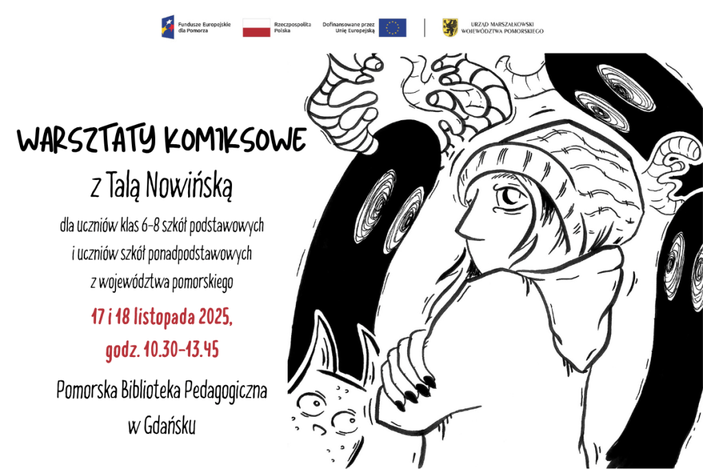 17 i 18 listopada 2025 roku odbędą się w naszej bibliotece kolejne warsztaty dziedzinowe w ramach projektu „Zdolni z Pomorza – wsparcie regionalne”. Tym razem osoby uczące się w pomorskich szkołach spróbują swoich sił przy tworzeniu komiksów. Prowadzącą warsztaty będzie Tala Nowińska. Szczegóły poniżej.